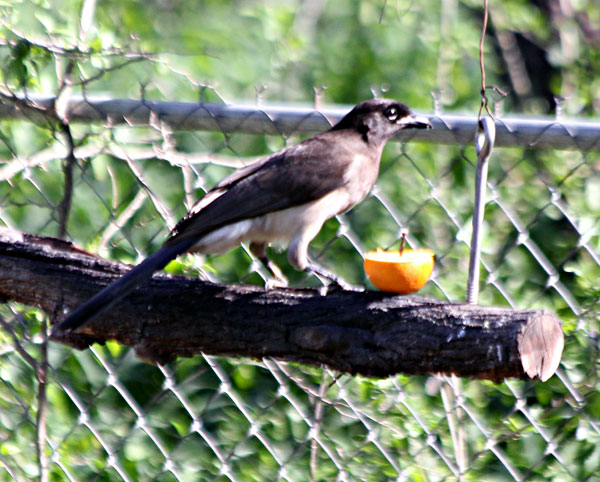 This morning, with modest expectations, we drove down to Salenino again and walking in, learned that the Brown Jay had come in about 8:30 but had left. We sat around, watched Greater Kiskadees and Altimira Orioles along with all the other visitors when suddenly Cheryl said, “There he is, over by that feeder.” Well, once it showed it was hard to miss — nearly the size of a crow and perched there, munching on an orange, to the accompaniment of camera shutters and birders oohing and aahing. The Jay left after 10 minutes or so but likely was back later in the morning for some chicken leftovers put out for him.