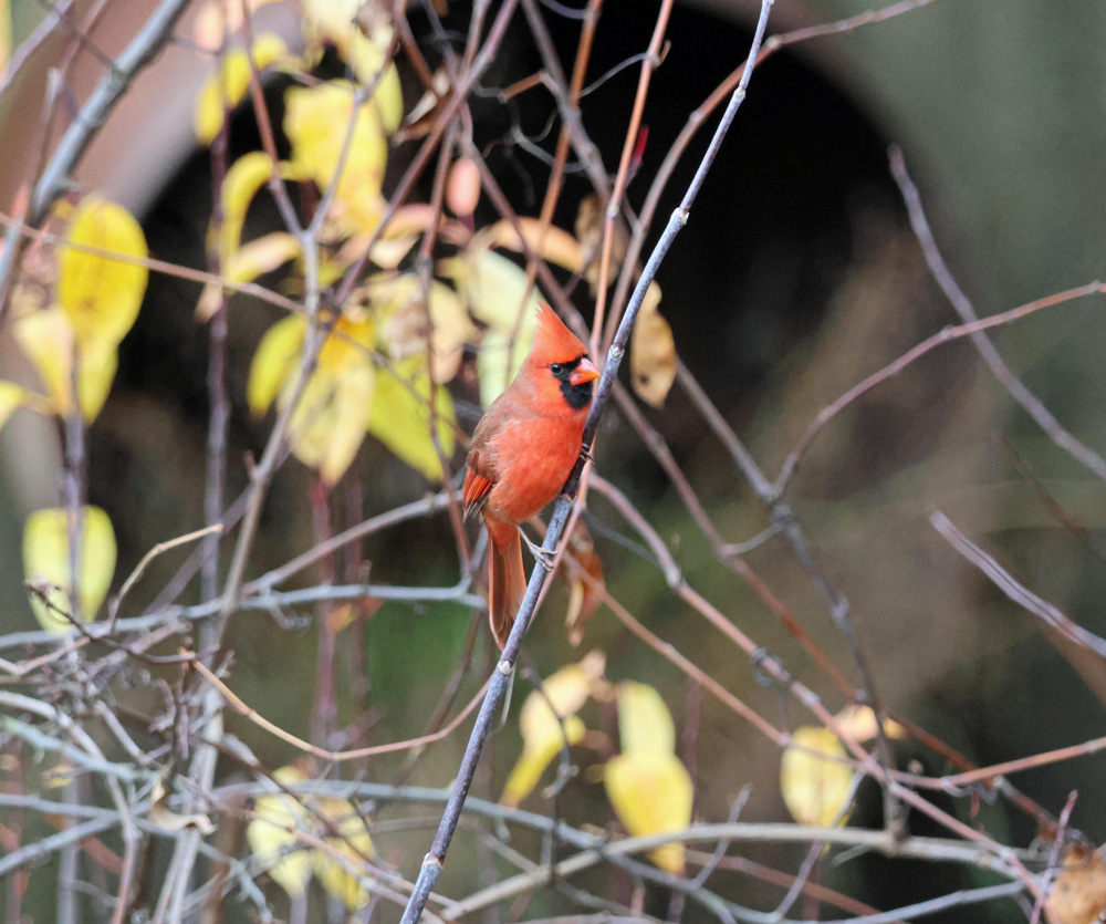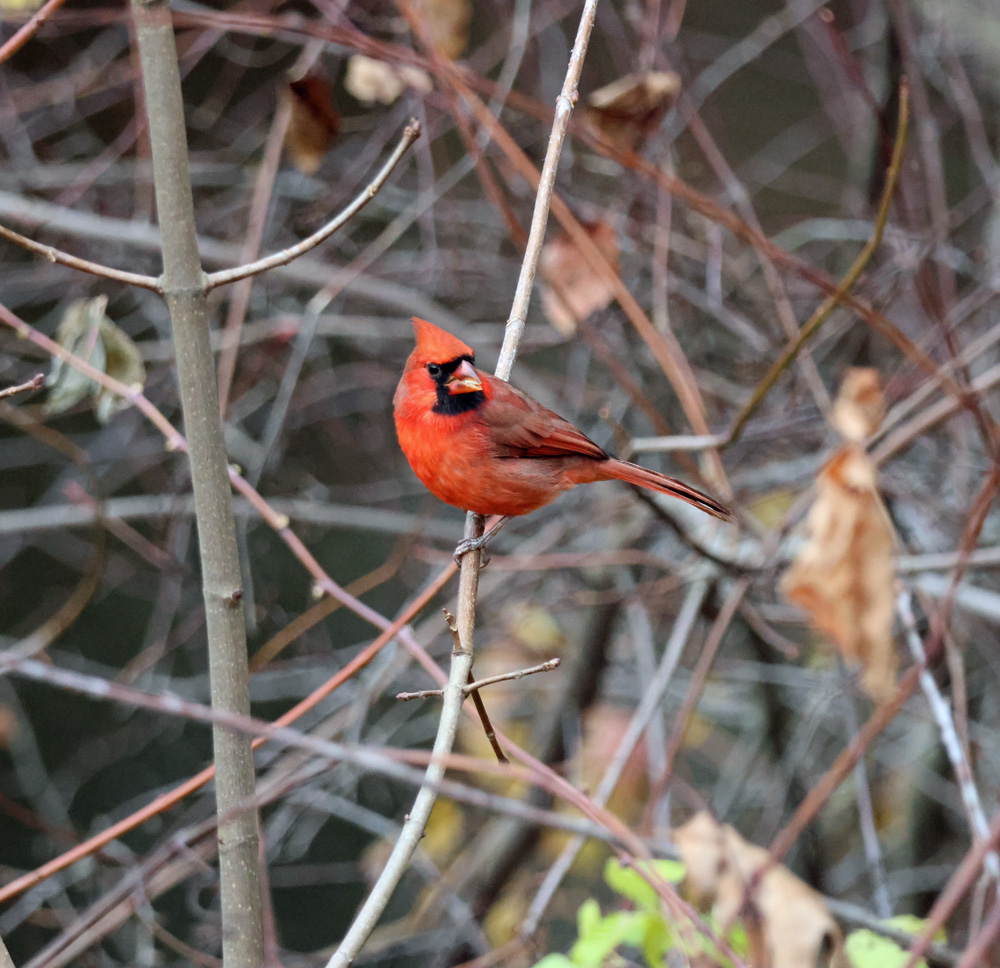I took it out for a dreary stroll today and came upon a half-dozen Northern Cardinals. The dog tugged on the leash. I tried to sort out this new rig. I got a few shots under gray skies.